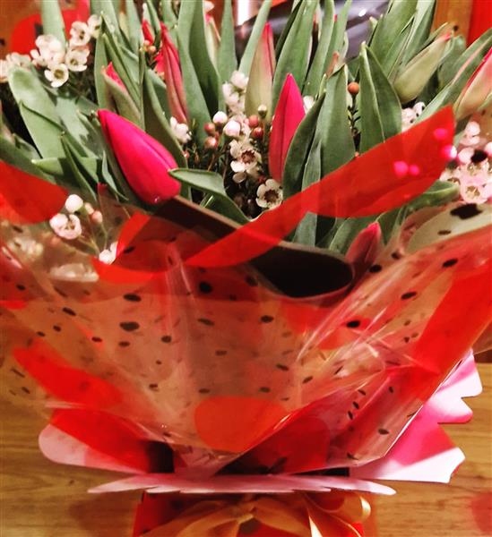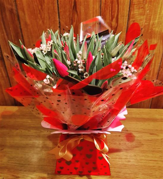 Red tulip bouquet with greenery and filler flowers in beautiful heart wrapping perfect for valentines day