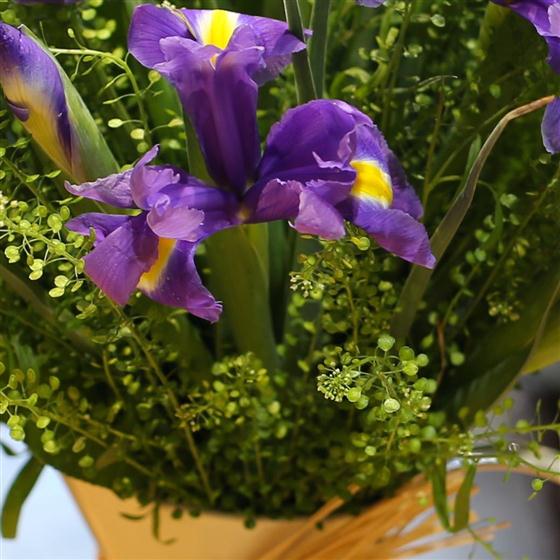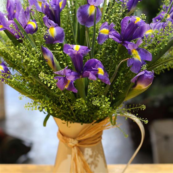 An enamel jug filled with beautiful spring iris. A simple and elegant gift.
