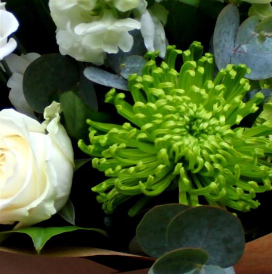 Simple and stylish, this white and green hand tied bouquet brings together arum lilies, roses, hydrangeas and shamrock blooms to create a classic option.