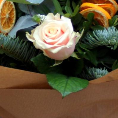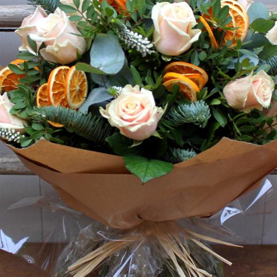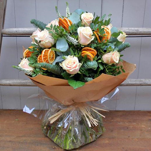 Palest peach roses, white veronica, eucalyptus and dried orange slices are the ingredients of this unusual beautifully scented hand tied bouquet.